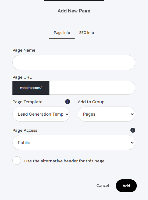 After selecting a template all you need to do is add Name, URL for the page and select a Group (folder) that is used for better organization of your pages and click Add to finish.