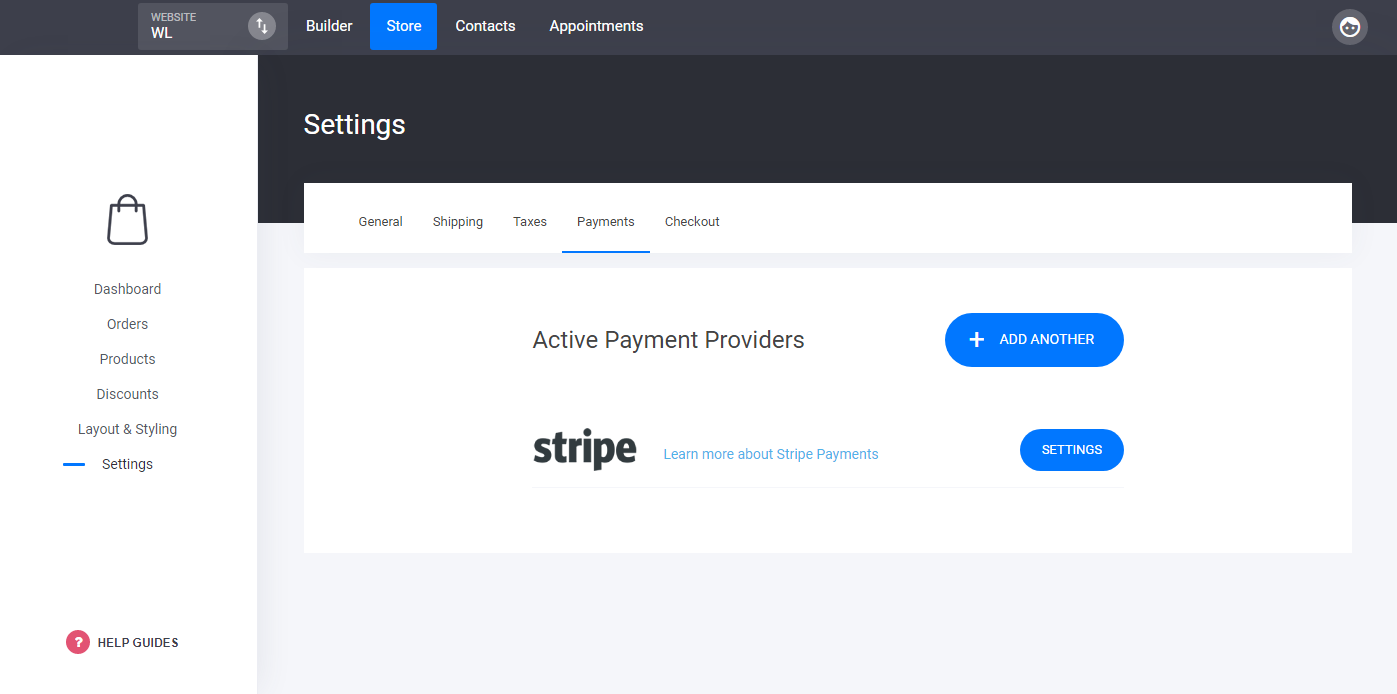 Then select Payments and 'Add Another' to add Stipe to your E-Commerce Store. You will be asked to add your Stripe Keys in order to create the connection: