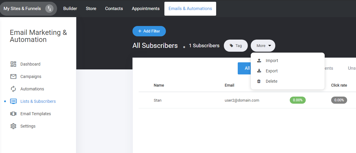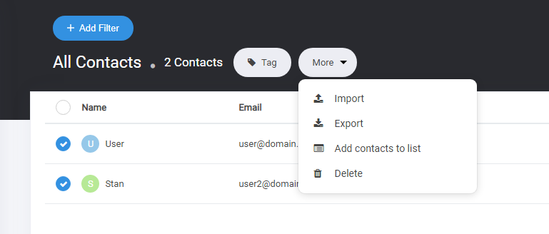 You can also subscribe users in bulk from your current Contacts tab by marking them and clicking on More. Then select Add Contacts To List and select to which list you want to add them. This will subscribe and add the contacts to the selected list.