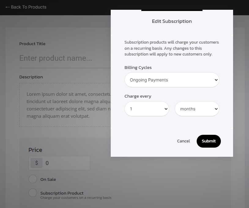 In the product you will see under the price that you enter a checkbox to make the product a Subscription and select the cycle of the payment.